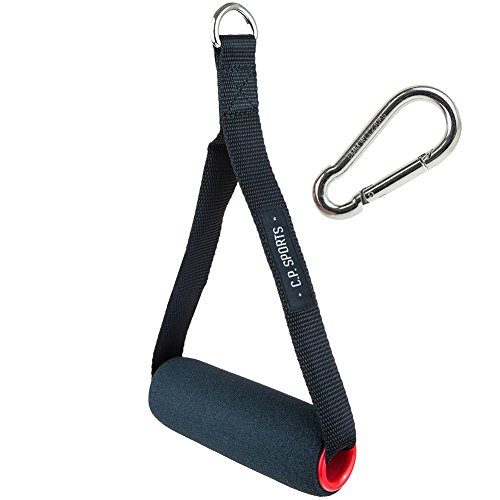 De C.P. Sports gevoerde handgreep met één hand is geschikt voor alle trekoefeningen op de kabeltrektoren. Hij is draaibaar, comfortabel gevoerd, extreem licht en daardoor zeer comfortabel in gebruik. Met stevige, verchroomde metalen ring aan belastbare nylon bandjes voor ophanging. Bijzondere kenmerken: comfortabel gevoerde handgreep max. Belastbaar tot ca. 35 kg; extreem licht en draaibaar; greepbreedte 13 cm; diameter 3,5 cm; totale lengte hangend ca. 24 cm stabiele, verchroomde metalen ring om op te hangen aan de kabeltrektoren, eenheidsmaat, kleur: zwart, levering: 2 C.P. Sports handgreep met één hand gevoerd + 2 karabijnhaken.
