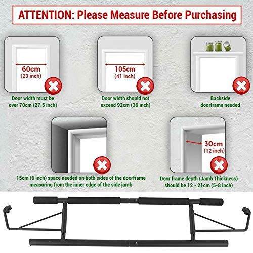 5. Onze oefenstang heeft slechts een deurframe van 7092 cm/27,536,2 inch nodig. Het deurframe is stevig bevestigd om het maximale draaggewicht van 130 kg/286,6 lbs te garanderen.